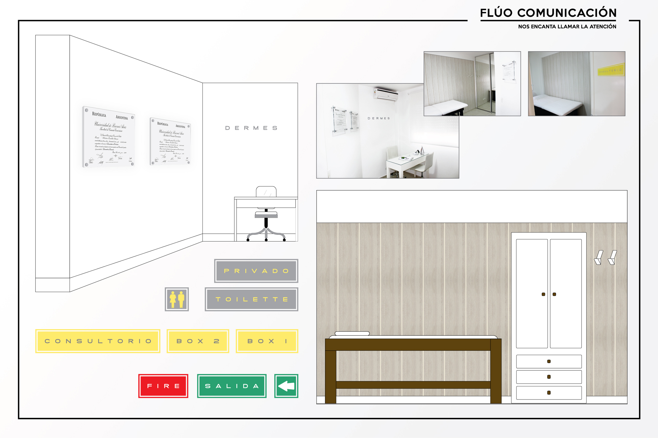 Señáletica interna en acrílico, revestimientos en madera tableada, mobiliario y pintura interior.